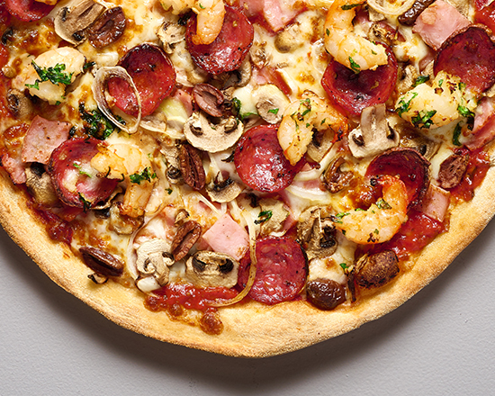Tomato Base, Bubba's Original Smoked Leg Ham, Salami, Garlic-Marinated Prawns, Mushroom, Spanish Onion, Kalamata Olives and Mozzarella